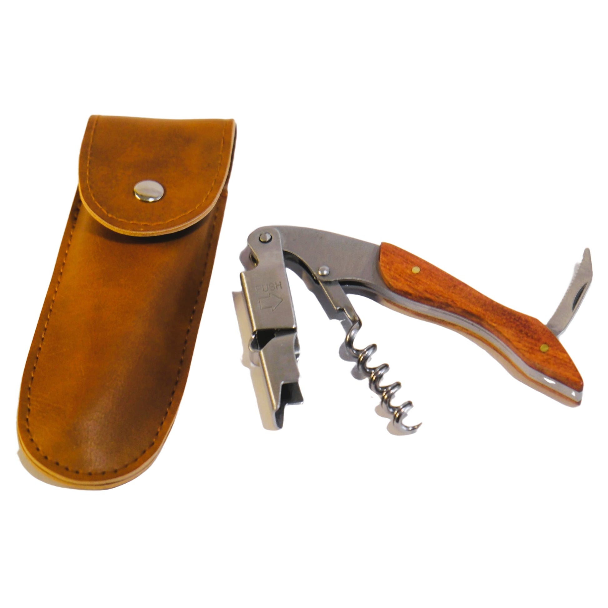 Sacacorcho profesional tipo camarero con acción de doble palanca, mango ergonómico, diseño de doble bisagra, abridor de botellas, cortador de papel de aluminio. Funda de piel sintética